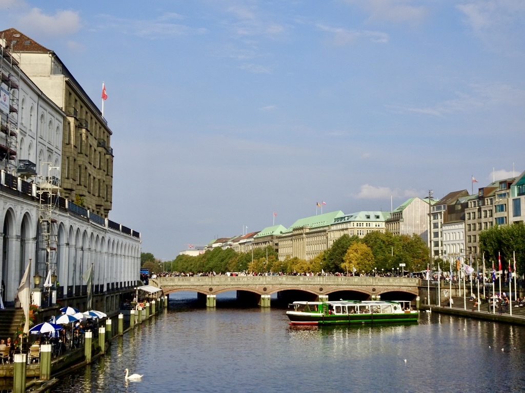 Der Jungfernstieg ist eine herrliche Flaniermeile und das Herzstück der Stadt. Früher gingen hier die Familien an den Sonntagen spazieren, um ihre unverheiratete Töchter (die Jungfern) vorzuführen. Außerdem war der Jungfernstieg im Jahre 1838 Deutschlands erste asphaltierte Straße.
