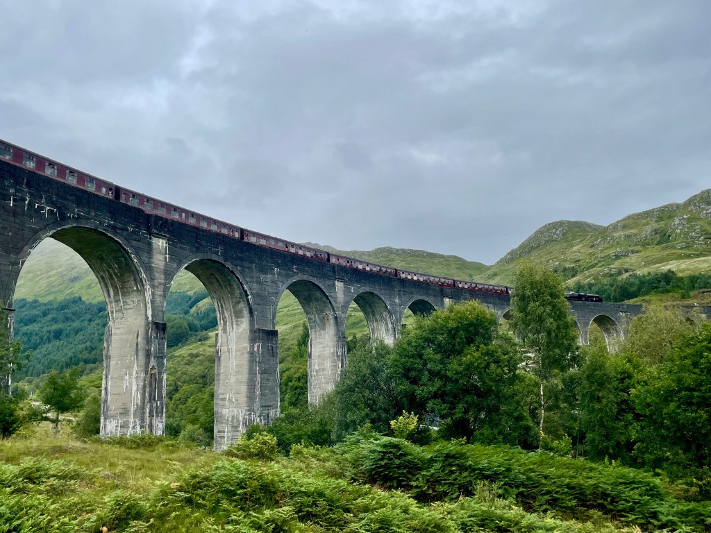 Den wohl berühmtesten Streckenabschnitt des Hogwarts Express kannst du im weitläufigen Tal zum Fuße der Eisenbahnbrücke selbst besuchen. In der Hochsaison wird der kleine unscheinbare Ort in den schottischen Highlands, nur so von Besuchern überrollt. Denn vom Vom 9. April bis 26. Oktober kommt der Jacobite Steam Train von Montag bis Freitag gegen 10:55 oder 15:00 Uhr laut tutend und meist voller winkender Passagiere über das Viadukt gefahren. Dabei ist er auf seinem Weg von Fort William nach Mallaig.