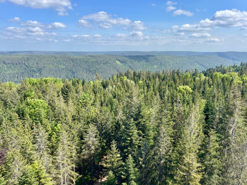 Am Ende des Pfades befindet sich der 40 Meter hohe Turm, von wo aus du einen wirklich spektakulären 360 Grad Blick hast. Wer mag, kann die 40 Meter bis zum Waldboden auf einer Riesenrutsche zurücklegen. Wem die 12,50 € pro Person zu teuer sind, der findet im Schwarzwald auch zahlreiche kostenlose Aussichtsorte (Aussichtspunkte im Schwarzwald). Nicht aufgelistet aber dennoch absolut lohnenswert, ist die Aussicht vom Parkplatz am Mummelsee.