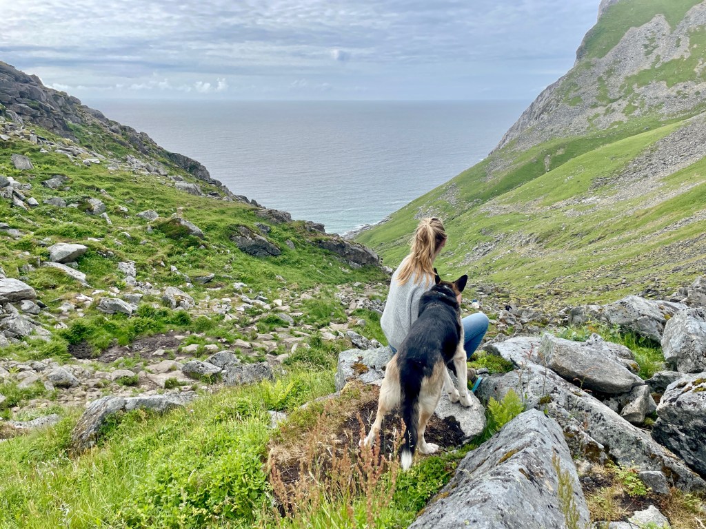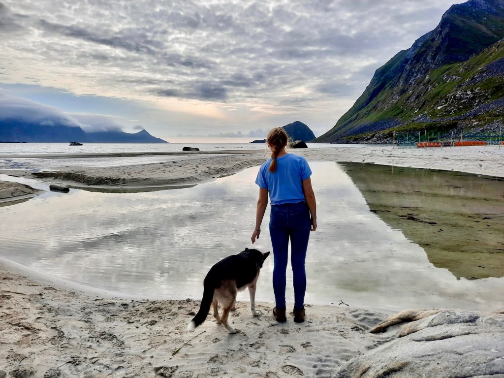 Die Lofoten sind ein wahres Wanderparadies. Doch nicht jede Wanderung eignet sich auf für Hunde. Häufig habe ich erst dann realisiert, dass eine Wanderung für meinen Hund doch nicht unbedingt geeignet ist, wenn wir schon einige Kilometer zurückgelegt hatten. So ging es mir z.B. auch während Gismos und meinem Aufstieg zum Preikestolen (Roadtrip mit Hund durch Südnorwegen Teil I). Besonders die Steigungen, das viele Geröll und die engen Wege auf denen dir viele Wanderer entgegen kommen, können für Hunde zur Herausforderung werden. Auf den meisten Wanderungen gibt es zahlreiche Wasserstellen (Flüsse, Seen), wo dein Vierbeiner trinken kann. Prüfe das aber unbedingt im Vorhinein! Dank des Golfstroms bleibt das norwegische Nordmeer im Winter auf den Lofoten zwar eisfrei, besonders warm wird die See aber auch in den Sommermonaten Mai bis August nicht, mit durchschnittlichen Wassertemperaturen von 9 bis 13 Grad Celsius. Mein Hund Gismo hat sich bei den kühlen Wassertemperaturen jedoch richtig wohlgefühlt.