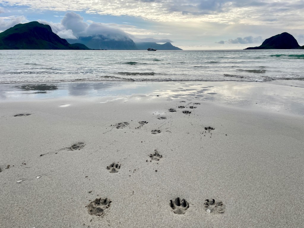Norwegen ist ein Land von unglaublicher Schönheit und Größe. Besonders der Kontrast zwischen den scheinbar aus dem Meer emporgestiegenen Bergen, den karibisch anmutenden Stränden mit ihrem türkisfarbenen Wasser, den schroffen Fjorden und pittoresken Fischerdörfern, ist mir von meiner Lofoten-Reise in Erinnerung geblieben. Ebenso die roten Fischerhütten mit ihren dunklen Dächern, zwischen denen der Stockfisch an langen Holzstäben trocknet. Die Abendspaziergänge mit Gismo im goldenen Licht der Mitternachtssonne, die mir nun einige Monate nach seinem Tod so sehr fehlen. Die Lofoten sind ein wahrer Sehnsuchtsort, ein Mekka für Wanderer, Skifahrer und Surfer. Lebensraum diverser arktischer Tierarten und Pflanzen. Sie vereinen einfach all das, was das Land ausmacht – Norwegen in a nutshell eben.