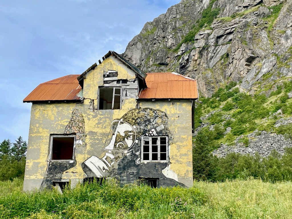 Auf Gimsøya kannst du außerdem eines der bekanntesten Werke des unter des Pseudonym Pøbel (zu deutsch: Volk) arbeitenden Street-Art-Künstlers sehen. Butterfly nennt er das Graffiti, das einen Mann mit Gasmaske auf der gelben Häuserwand zeigt. Ob er damit auf Kriege oder die Bestrebungen norwegischer Investoren, auf den Lofoten Erdöl und Erdgas zu fördern, anspielt, ist allerdings unklar. Weitere Werke von ihm sind The Stardom Glow in Bryne oder The Pipe-smoking fisherman in Henningsvær.