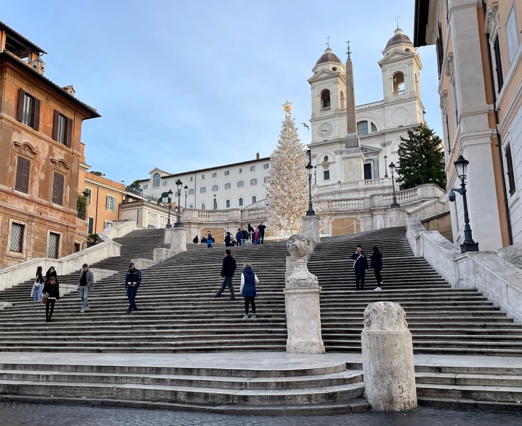 Am Fuße der Kirche Trinità dei Monti befindet sich eine der bekanntesten Freitreppen der Welt, die Spanische Treppe (italienisch: Scalinata di Trinità dei Monti). Ihre Bezeichnung ist allerdings etwas Irre führend – tatsächlich wurde die barocke Treppe von einem italienischen Architekten entworfen und mit dem Nachlass des französischen Diplomaten Etienne Gueffier finanziert. Wieso also Spanisch? Die Treppe ist nach dem Piazza di Spagna (Spanischer Platz) benannt, auf dem sie sich befindet, welcher wierrum auf die Spanische Botschaft beim Heiligen Stuhl zurückgeht. Erbaut wurden die 136 Stufen der Spanischen Treppe zwischen 1723 und 1725 aus Travertin, einem hellen, porösen Kalkstein. Sie sollten einen wild bewachsenen Abhang verdecken, der von der Kirche Santa Trinità dei Monti zur Piazza di Spagna hinabführte. Der damalige Papst Innozenz XIII. empfand diesen Abhang nahe der Kirche als unpassend.