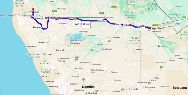Ich gebe zu, die Fahrt von meiner letzten Station im Caprivi, dem Ngepi Camp am Cubango Fluss, bis nach Ruacana habe ich unterschätzt. 857 Kilometer, knappe 10 Stunden Fahrt, und das an nur einem Tag. Selbst für meine Verhältnisse ist das viel. Pünktlich zum Sonnenaufgang war ich in Rundu und fuhr dann dann immer schnurgeradeaus, entlang der angolanischen Grenze. Dabei durchquerte ich Landschaften und Dörfer entlang der B10 und C46, in die sich ansonsten garantiert keine Touristen verirren. Das erkannte ich anhand der Reaktion der Locals.