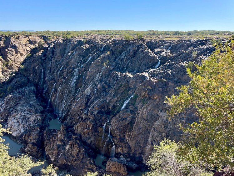Am späten Nachmittag errreichte ich die Wasserfälle von Ruacana. Du folgst der D3700 bis zum Ende. Dort siehst du eine Schranke, neben der es sich gewöhnlich ein Wachmann auf einem Plastikstuhl gemütlich macht. Du stellst dich vor, er notiert dein Kennzeichen und weiter gehts. Dafür folgst du einfach dem steinigen Weg bis zu einer Ruine, an der dieser einfach endet. Als ich parkte, befand sich dort noch das Auto eines deutschen Ehepaars, ansonsten saßen nur einige Kinder auf einer Mauer und baten um Essen. Die Wasserfälle hörte ich jedoch schon, als ich aus dem Auto stieg. Obwohl der Kunene einer von den fünf Flüssen in Namibia ist, der ganzjährig Wasser führt, überraschte mich der niedrige Wasserstand. Grund dafür sind neben den geringen Niederschlagsmengen zuvor im Angolischen Hochland, dass die Wehrtore der zwei Wasserkraftwerke am Kunene zum Zeitpunkt meiner Reise wohl geschlossen waren. Eines von ihnen wurde bereits 1970 von Südafrika zur Wasserversorgung errichtet. Am beeindruckensten sollen die Ruacana Wasserfälle daher bei Hochwasser zum Ende der Regenzeit sein (April/ Mai) oder bei Schleusenöffnung des 40-Kilometer weiter flussaufwärts gelegenen Stausees Calueque Damm.