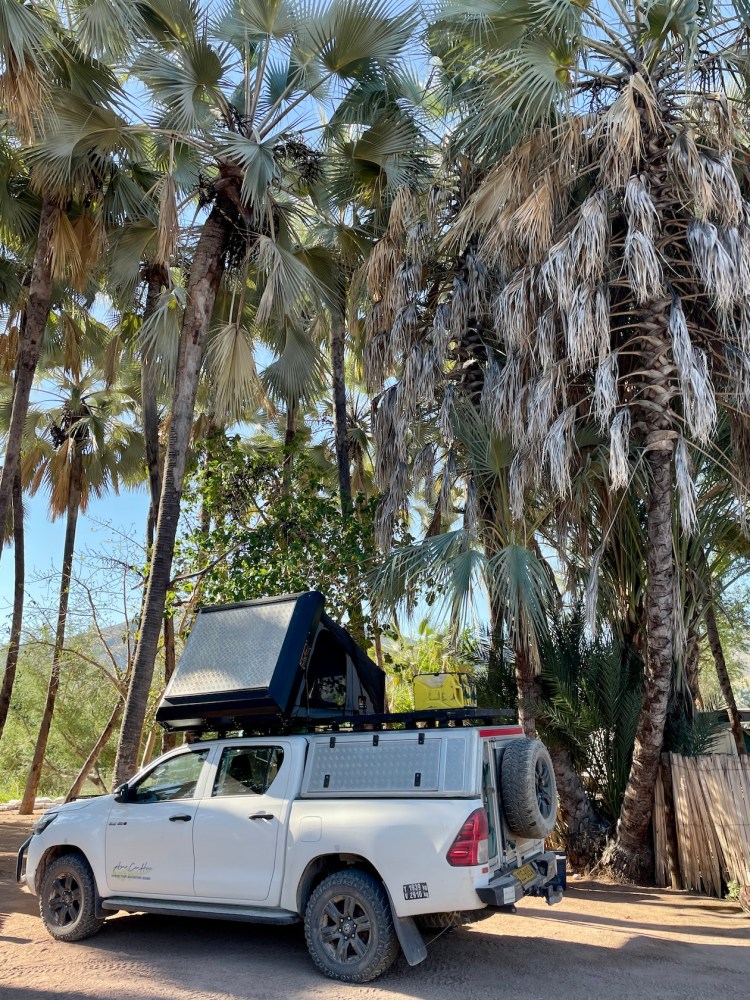 Das Zitat „Ankommen ist ein Moment, unterwegs sein ein Zustand“ hat auf meiner Reise durch Nordnamibia eine ganz neue Bedeutung bekommen. Ich bin jeden Morgen zeitig aufgebrochen, weil ich zur frühen Stunde einfach am fittesten bin. Begleitet von Hörbüchern, Podcasts und meiner liebsten Roadtrip-Playlist (die ich dir auch auf Horseshoe Travel verlinkt habe), habe ich mich bei Laune gehalten und stets darauf geachtet, ausreichend Wasser, Snacks und natürlich Diesel für den Hilux an Bord zu haben. Mindestens genauso wichtig wie das Weiterkommen waren jedoch die Pausen – um durchzuatmen, zur Ruhe zu kommen und die unfassbar schöne Landschaft entlang des Kunene einfach auf mich wirken zu lassen.