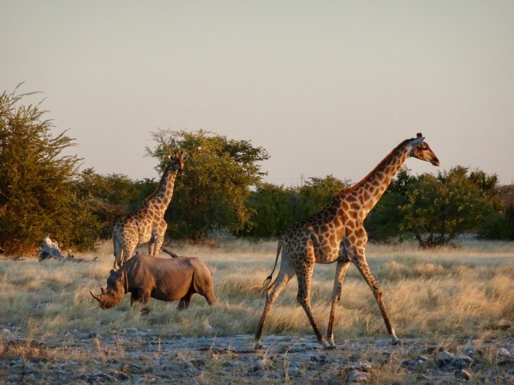 Der Etosha-Park ist für seine diverse Tier- und Pflanzenwelt bekannt. Tatsächlich findest du hier die größte freilebende Population an Spitzmaulnashörnern. Übrigens kommt es super selten vor, dass sich Breit- und Spitzmaulnashörner über den Weg laufen. Sie nutzen zwar häufig dieselben Wasserlöcher, bevorzugen aber unterschiedliche Uhrzeiten. Apropos Wasserlöcher – es gibt im Park keine fließenden Gewässer, sodass die Tiere außerhalb der Regenzeit auf die natürlichen und künstlichen Wasserstellen angewiesen sind. Gegen Ende der Trockenheit versiegen die natürlichen Wasserstellen weitesgehend und es versammelt sich mehr Wild an den künstlichen Wasserstellen. Aus der Salzpfanne trinkt übrigens kaum ein Wildtier. Die meiste Zeit des Jahres ist sie ausgetrocknet und bei Regen führt sie nur flaches, stark salzhaltiges Wasser.