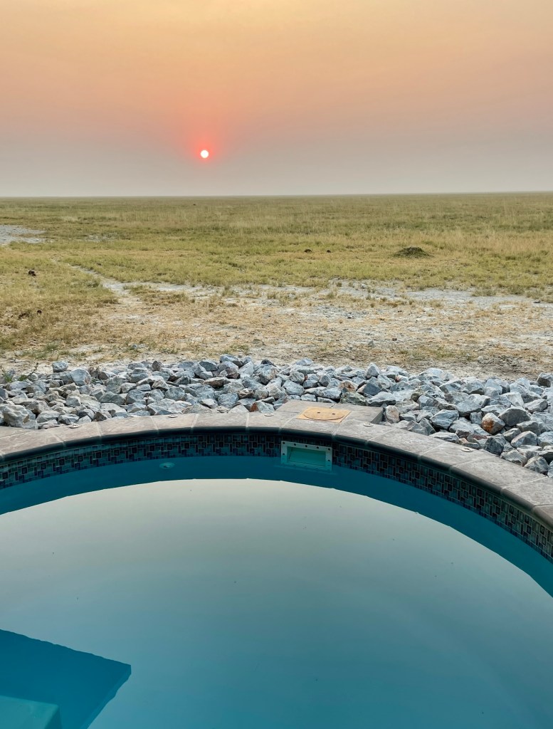 - Etosha King Nehale Lodge – wenige Kilometer vom King Nehale Gate entfernt, liegt diese von Gondwana betriebene Lodge. Sie bietet Halb- und Ganztagessafaris und besitzt ein privates Wasserloch abseits der Wege, wo wir an unserem ersten Nachmittag nicht nur auf ein Rudel Löwen, sondern auch eine riesige Elefantenherde stießen. Beim abendlichen Buffet wird Wildfleisch von Gnu, Kudu, Oryx und Impala aufgetischt und jeder Bungalow verfügt über einen eigenen kleinen Pool. Eine der schönsten Unterkünfte, in der ich in Namibia je übernachtet habe.