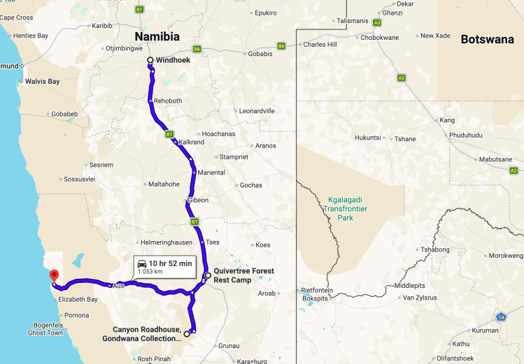 Viel zu Planen gibts da eigentlich nicht. Es gibt sowieso nur eine Möglichkeit und zwar von Windhoek kommend über die B1, die auch Mariental, Keetmanshoop und schließlich den Grenzübergang am Oranje bei Noordoewer miteinander verbindet. Als Teerstraße ist sie gut ausgebaut und problemlos zu fahren. Sobald man jedoch die Hauptstraße verlässt, gibt es nur noch Gravel Roads. Zum Fish River Canyon gelangt man beispielsweise von Keetmanshoop aus über die C12 oder C37. Richtung Aus und zu den Wildpferden von Garub fährt man ebenfalls über gut ausgebaute Teer- und Schotterabschnitte. In der Kalahari rund um Mariental sind viele Lodges nur über Sand- oder Farmwege erreichbar. Entfernungen auf der Karte wirken dabei oft harmlos. Für 200 Kilometer auf Schotter brauchst du oft mehrere Stunden. Nicht wegen dem Verkehr, sondern aufgrund von Straßenbeschaffenheit, Tieren am Wegesrand und der Versuchung, ständig für Fotos anzuhalten.