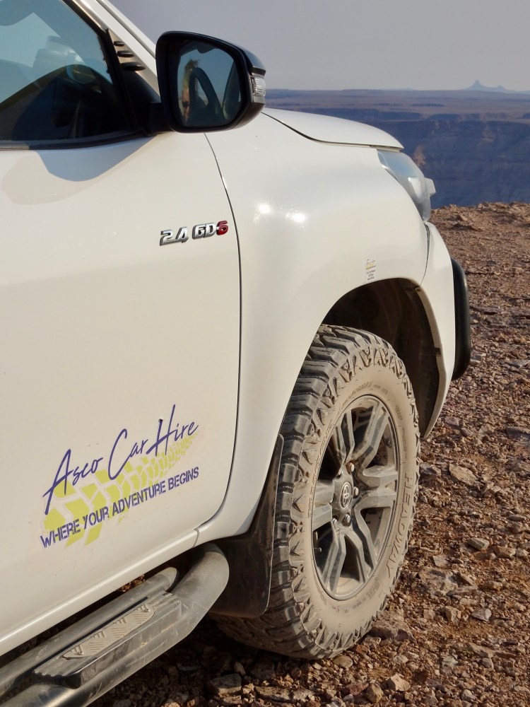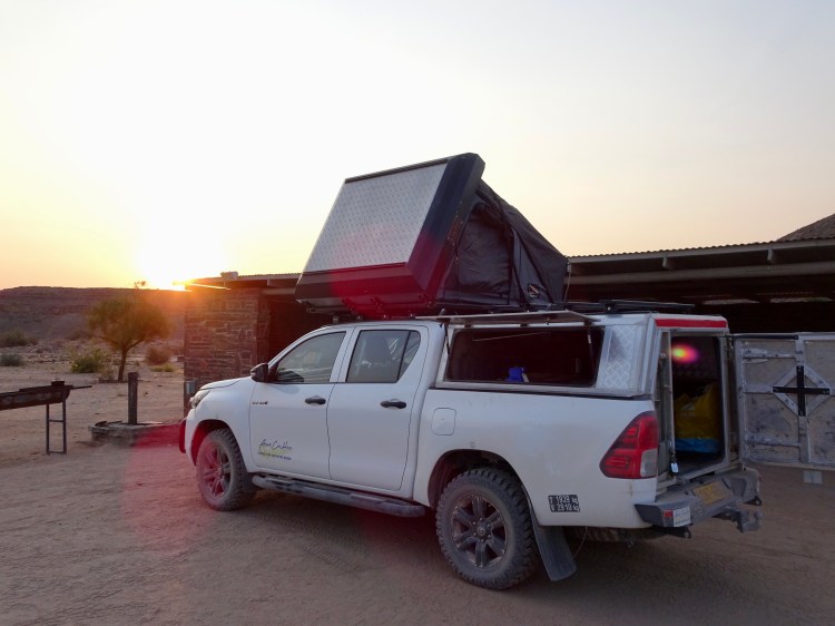 Für die beschriebenen Straßen brauchst du ein geländefähiges Auto mit ausreichend Bodenfreiheit und genügend Kraft, wenn es sandiger oder steiniger wird. Fast alle namibischen Mietwagenfirmen, die ich kenne, verleihen Allradfahrzeuge. Spare hier nicht am falschen Ende und buche keinen normalen PKW. Mehrere Reisende haben mir erzählt, dass sie genau das getan und es im Nachhinein bereut haben. Man ist langsamer unterwegs, fährt mit permanenter Sorge vor einem Platten und das gesamte Fahrgefühl ist deutlich holpriger. Wir entschieden uns stattdessen für einen Toyota Hilux bei Asco Car Hire und zahlten für 17 Tage reine Mietkosten 1.904 € – ein ganz normaler Preis für Allradfahrzeuge in Namibia. Hinzu kamen Extras wie eine zusätzliche Matratze sowie eine Versicherung mit reduzierter Selbstbeteiligung, insgesamt weitere 289 €.