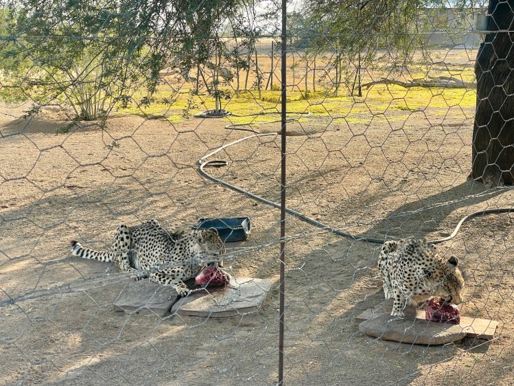 - Quivertree Forest Restcamp: Das Camp bietet Chalets sowie Stellplätze für Camper direkt neben den beeindruckenden Köcherbäumen. Zwei mit der Hand aufgezogene Geparden leben auch auf dem Gelände und werden täglich um 17 Uhr gefüttert. In den Chalets gibt es keine eigene Küche. Die meisten Gäste, wobei es in dieser abgelegenen Region ohnehin meist nur wenige sind, entscheiden sich daher für das Abendessen im Restaurant. Dieses war preislich absolut fair und wirklich lecker (bei uns gab es Oryx-Gulasch), auch wenn das Besitzerpaar auf uns leider ziemlich unfreundlich wirkte.